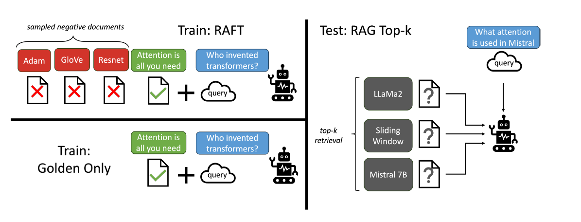 RAFT 는 이 문제를 모델 차원에서 해결하기 위해 고안된 방법이다. 질문과 함께 관련 문서와 비관련 문서가 섞인 문서 집합을 제공하고, 모델이 정답 근거 문서를 구분해 답변을 생성하도록 학습하는 방식이다.