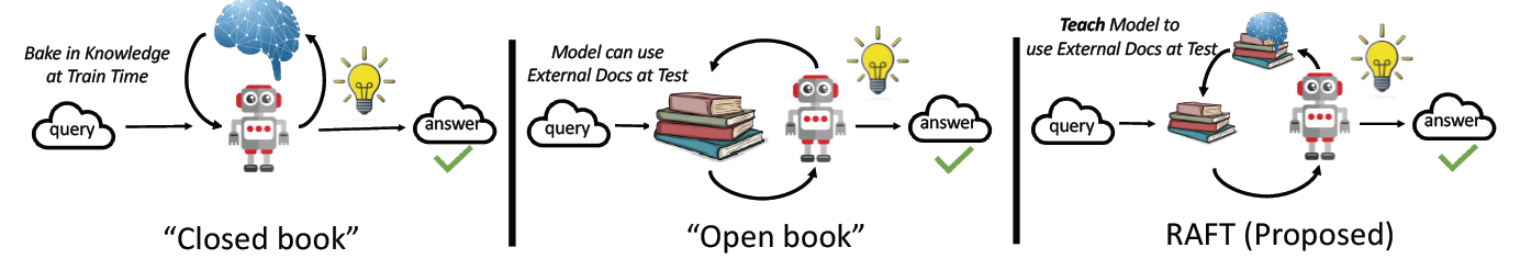 RAFT 논문은 LLM을 “도메인 특화 open-book 시험” 상황에 적응시키는 문제로 정의한다.