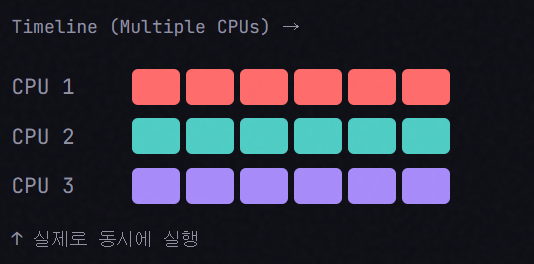 여러 작업을 물리적으로 동시에 실행하는 것이다.