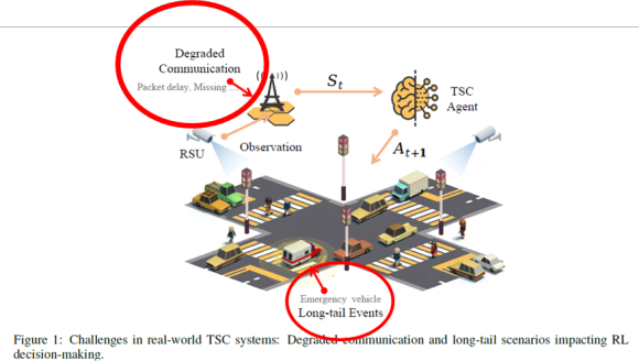 - RL-based TSC system often overlooks imperfect observations caused by degraded communication, such as packet loss, delays, and noise, as well as rare real-life events not included in the reward function, such as unconsidered emergency vehicles.