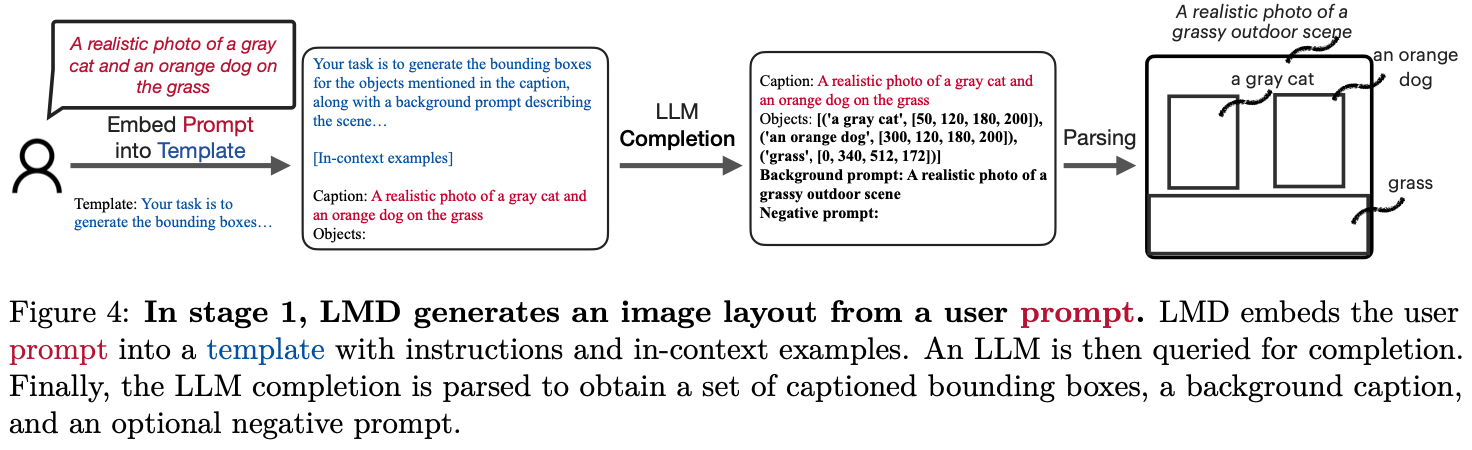 Diffusion Model 사용시, 그 전에 LLM layout을 하나 만들어 놓고 text로 이미지의 레이아웃을 구체적으로 text로 도출하고 이를 Diffusion Model에 집어넣으면 좀 더 완벽한 이미지가 생성된다는 논문이다.